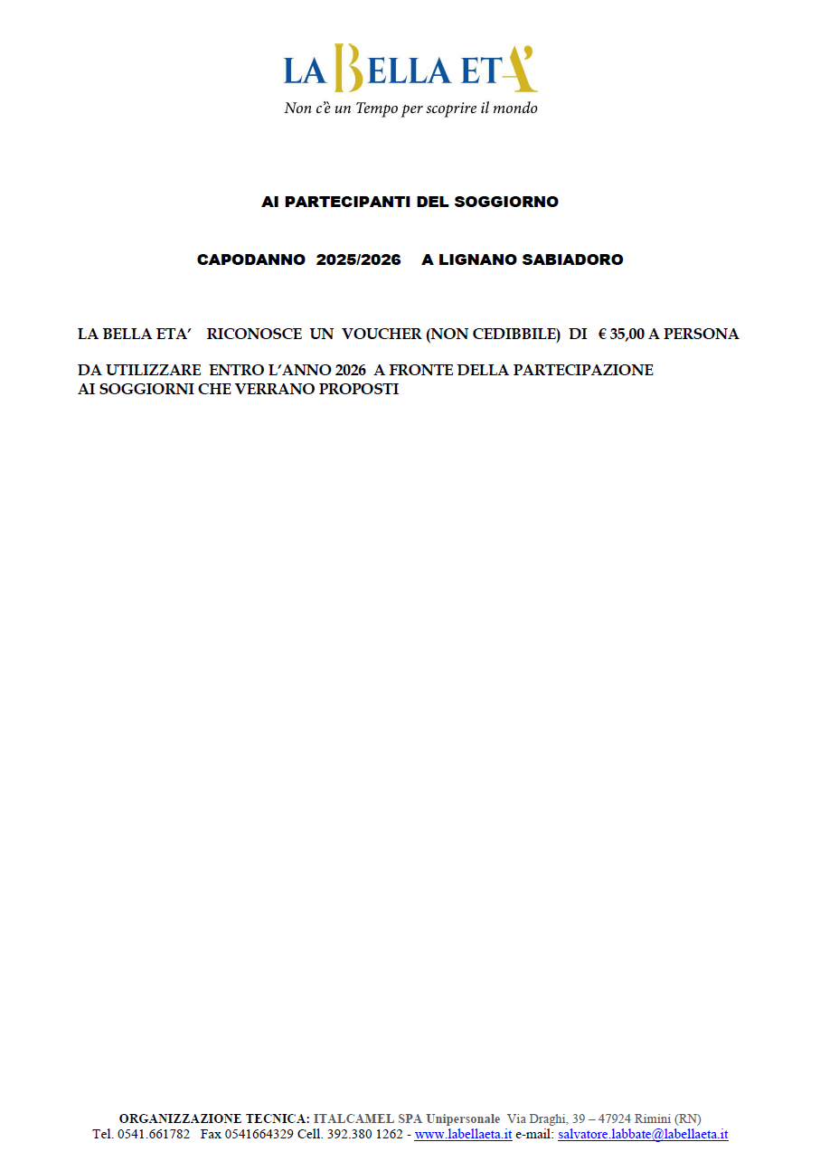 Soggiorni, Voucher Voucher Bella Età Da verewpadmin 28 Gennaio 2026 28 Gennaio 2026 2026, Lignano Sabbiadoro, Voucher Scarica la locandina Condividi: Fai clic per condividere su X (Si apre in una nuova finestra) X Fai clic per condividere su Facebook (Si apre in una nuova finestra) Facebook Correlati TOUR DI PASQUA IN TOSCANA – MONTECATINI TERME (PT) dal 03/04/26 al 07/04/26