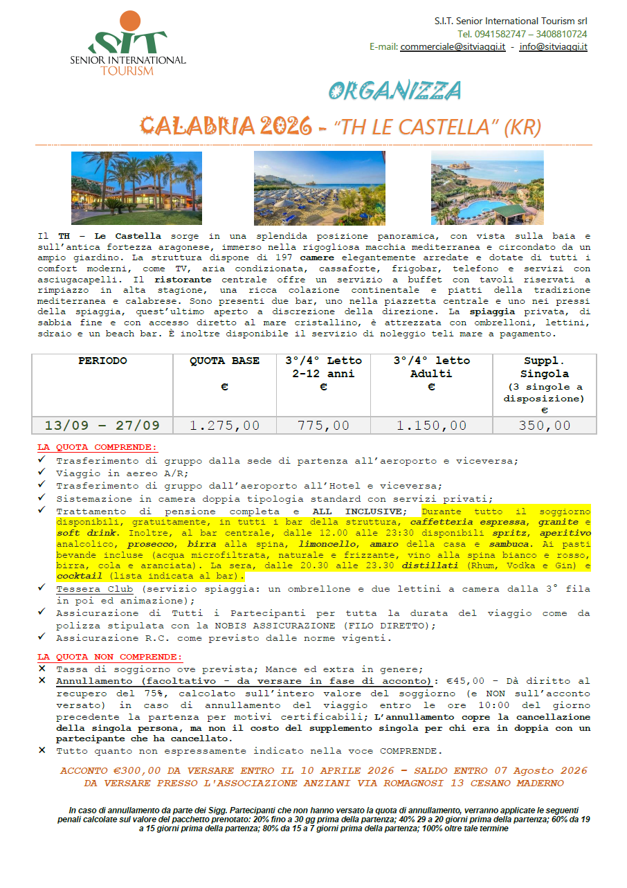 Soggiorni CALABRIA 2026 – “TH LE CASTELLA” (KR) – dal 13/09/2026 al 27/09/2026 Da verewpadmin 29 Gennaio 2026 29 Gennaio 2026 2026, Calabria Scarica la locandina Condividi: Fai clic per condividere su X (Si apre in una nuova finestra) X Fai clic per condividere su Facebook (Si apre in una nuova finestra) Facebook Correlati BASILICATA 2026 – “TH PISTICCI” (MT) – dal 02/06/2026 al 14/06/2026
